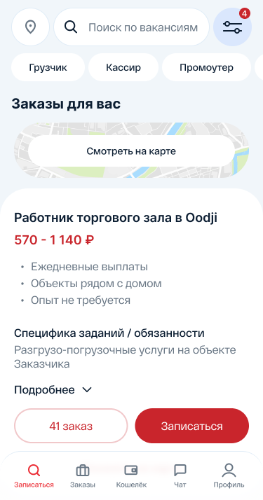 На карте отображаются доступные вакансии, на которые можно сразу откликнуться. При отклике необходимо оставить контактные данные, после чего с пользователем связывается менеджер.