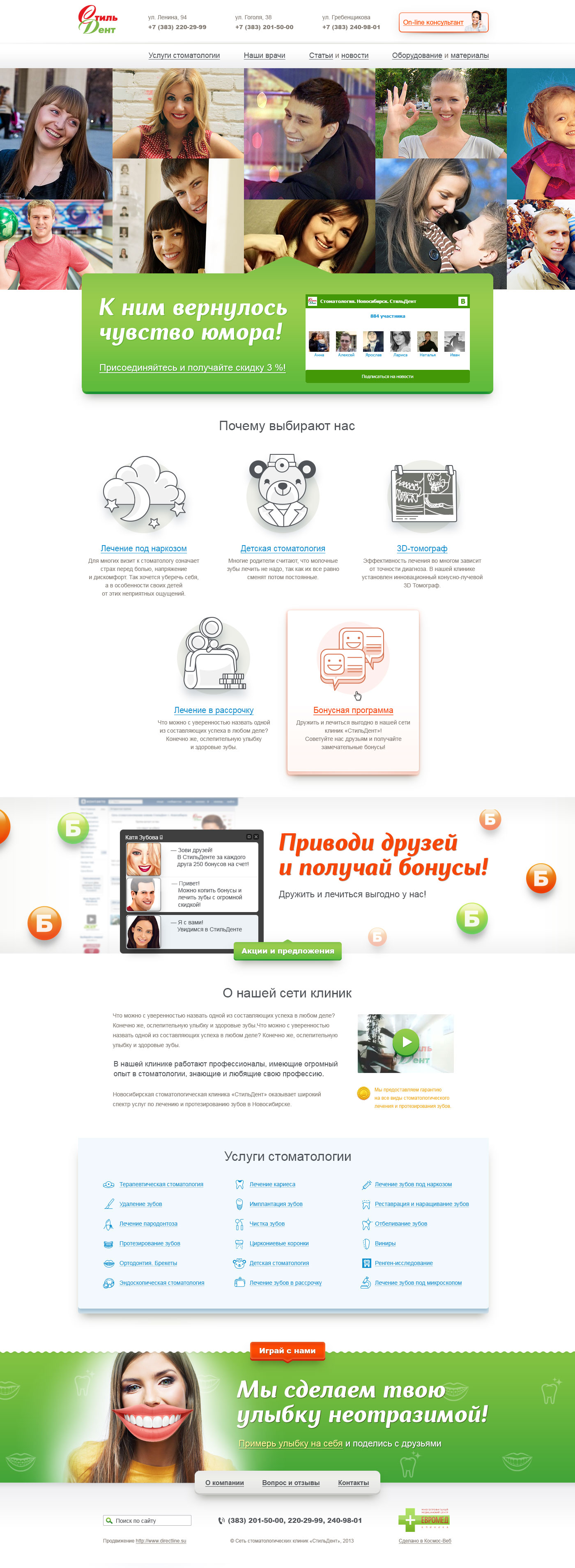 Все новые участники сообщества получают скидку на услуги стоматологии. Для тех, кто не уверен, приводятся убедительные преимущества, программа лояльности, факты о клинике. Далее можно ознакомиться со списком предлагаемых услуг.