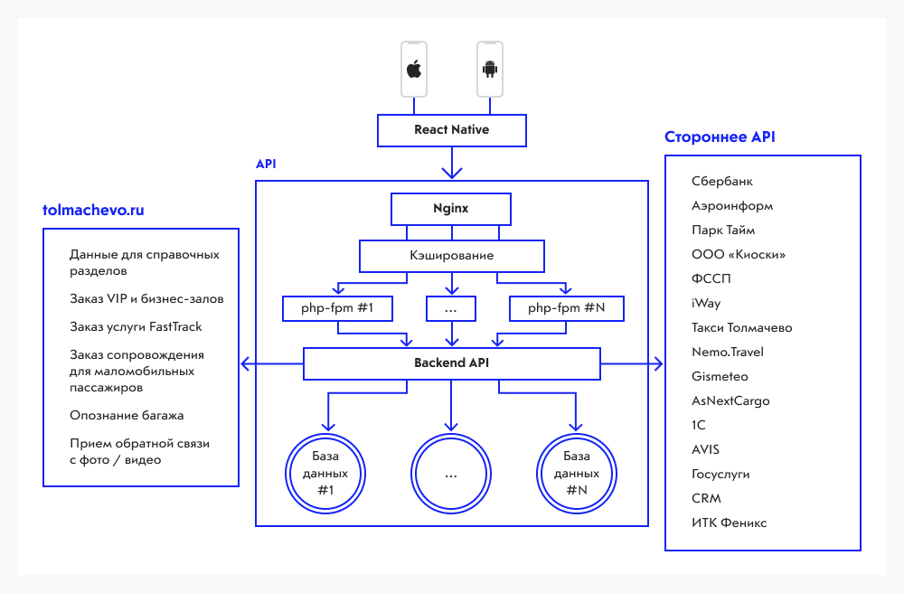 Предусмотрели интеграции с сайтом tolmachevo.ru и сторонними API. Для быстродействия и отказоустойчивости запланировали реализовать микросервисную архитектуру через Docker-контейнеры.
