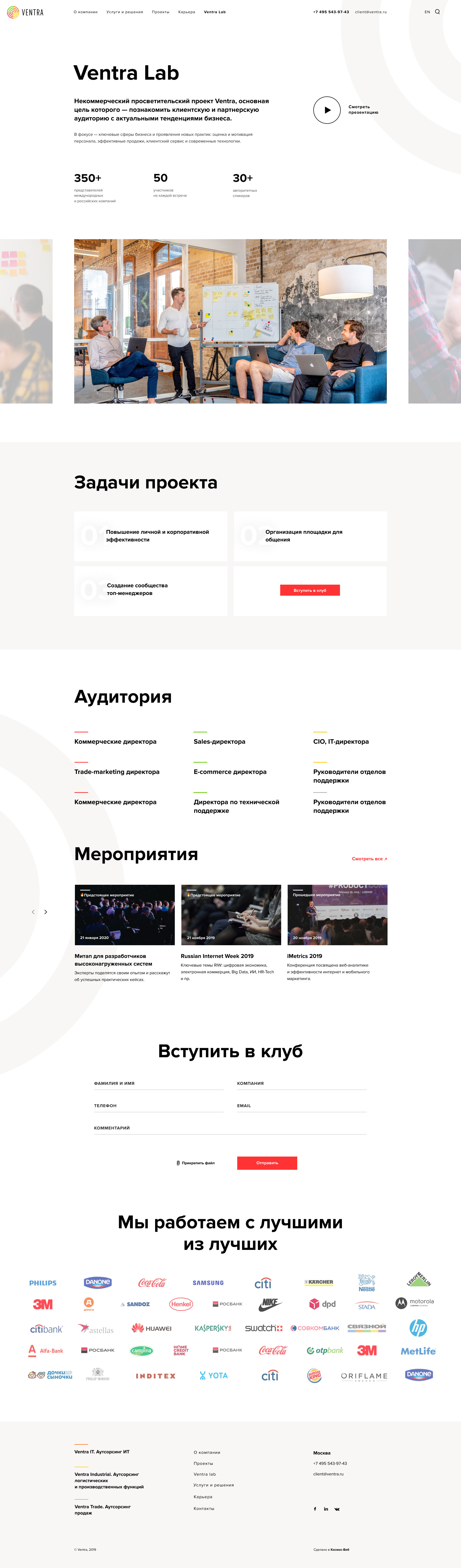 Направлений услуг много — клиенты на сайт заходят очень разные. Чтобы обеспечить наилучший пользовательский опыт, мы вынесли главные направления на первый экран — Ventra Trade, Ventra IT, Ventra Industrial.